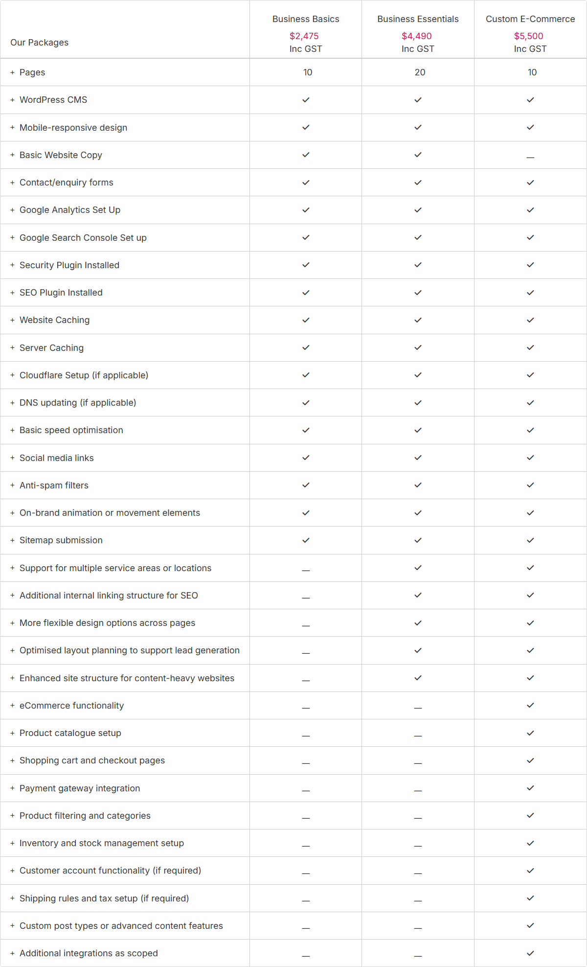 Not every business needs the same kind of website — that’s why we offer flexible packages to suit where you’re at and where you’re headed. Whether you’re starting out, expanding your services, or selling products online, our comparison table below makes it easy to see what’s included in each package so you can choose the right fit for your goals and budget.